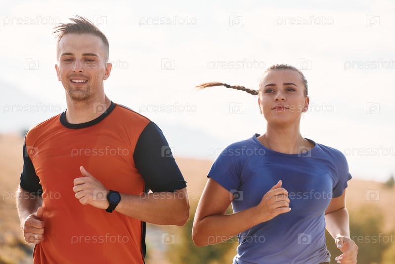 Пара в спортивной одежде бежит по живописной дороге во время утренней тренировки, наслаждаясь свежим воздухом и поддерживая здоровый образ жизни