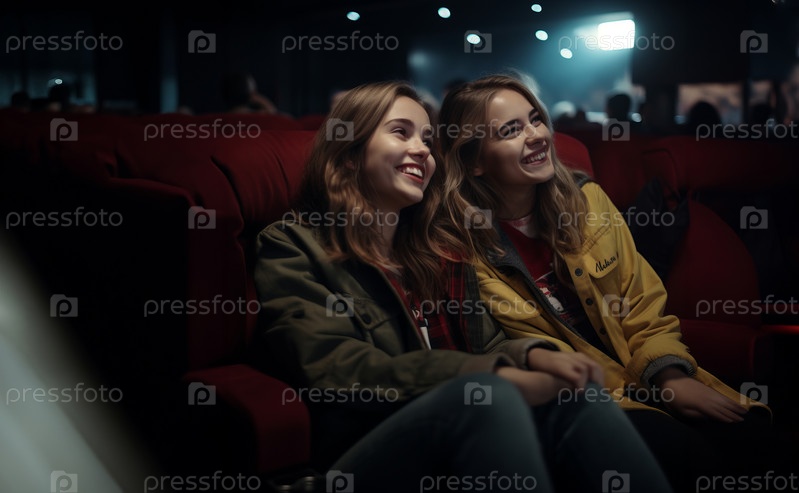Два современных друга сидят в кинотеатре, наслаждаются обществом друг друга и наслаждаются совместным просмотром фильма. Сгенерированное изображение