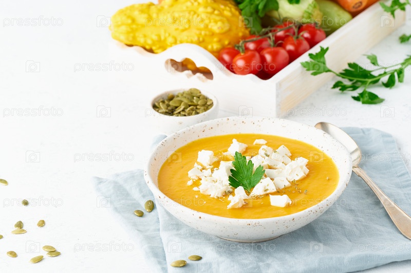 Суп-крем из тыквы с сыром фета, осенняя домашняя еда, белый фон, крупный план, пространство для копирования, сезонное вегетарианское блюдо