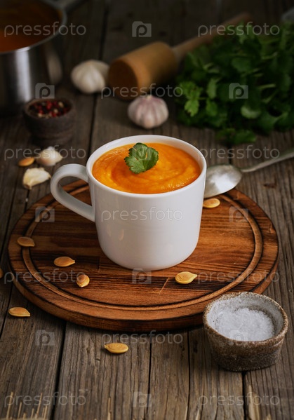 Суп-пюре из тыквы в чашке на коричневом деревянном столе, вертикальный, вид сбоку. Диетическое вегетарианское пюре на разделочной доске с петрушкой, чесноком