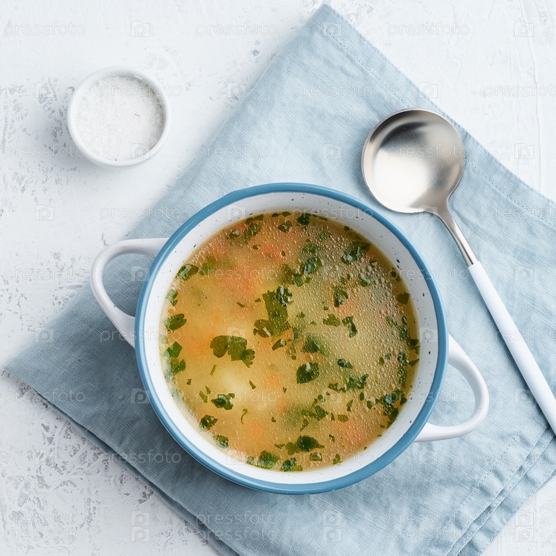 Куриный суп, скандинавская домашняя еда на синем каменном столе, вид сверху
