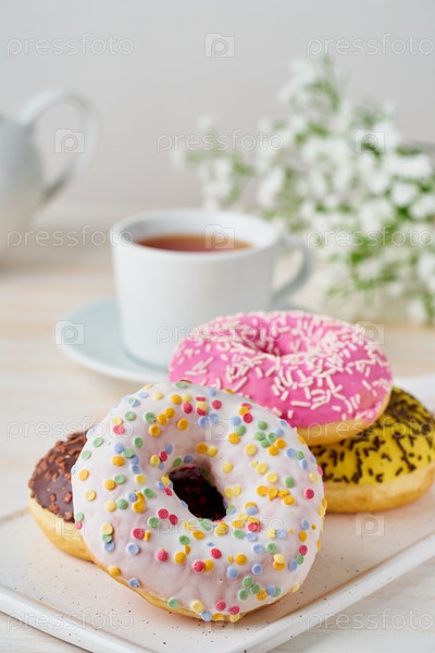 Пончики и чай. Яркая, красочная фаст-фуд. Вертикальный. Светло-бежевый деревянный фон. Вид сбоку, крупным планом