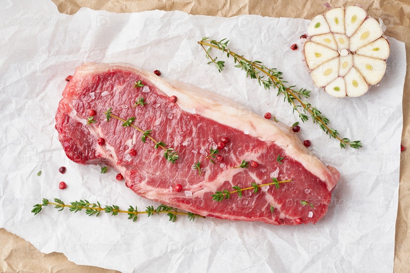 Большой кусок сырой говядины, стриплойн на белой пергаментной бумаге