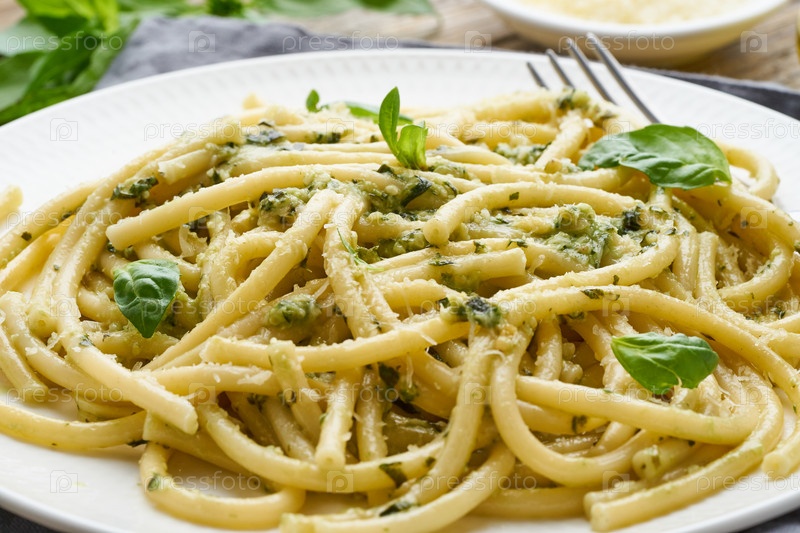 Паста спагетти песто с базиликом, чесноком, кедровыми орешками, оливковым маслом. Деревенский стол, макрос