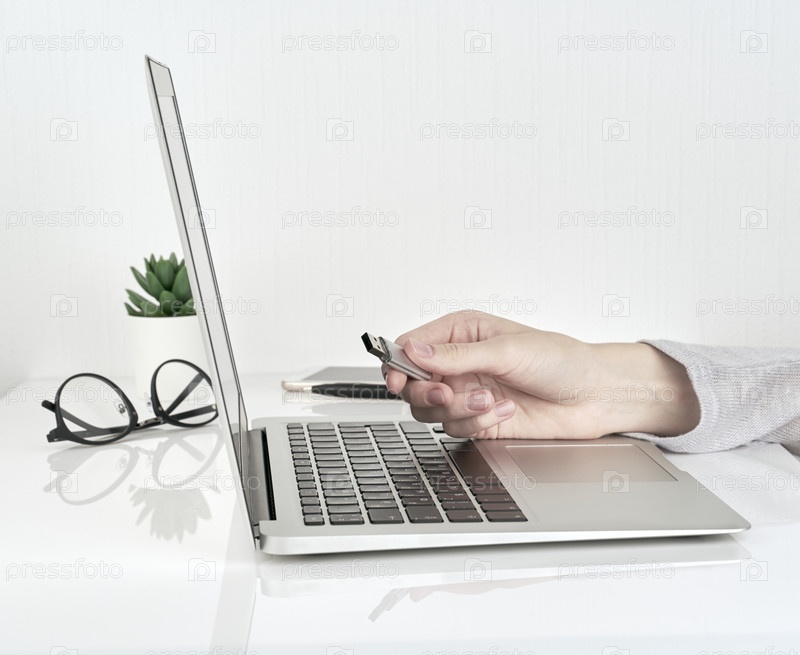 Человек открывает флешку USB рядом с ноутбуком, концепция офисной работы на фоне белой стены