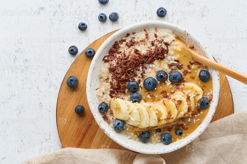 Овсянка с ягодами и фруктами, диета, на деревянном белом фоне, вид сверху