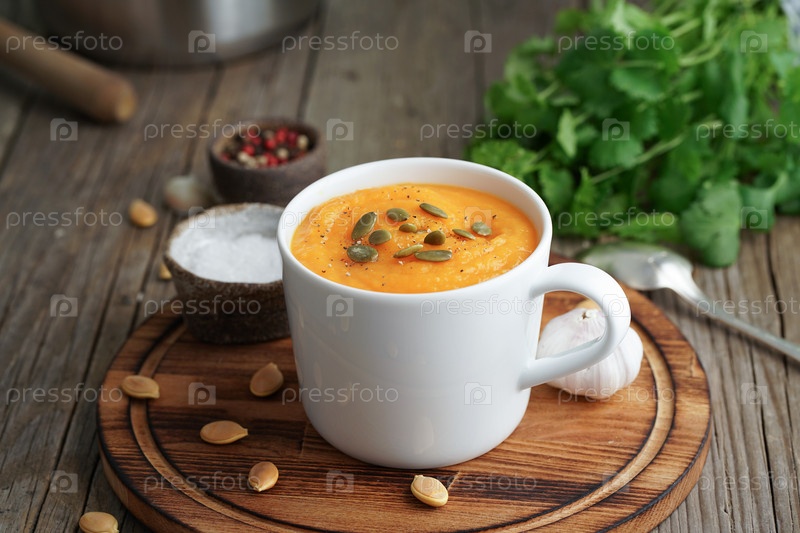 Пюре из тыквенного крем-супа в чашке на коричневом деревянном столе, вид сбоку