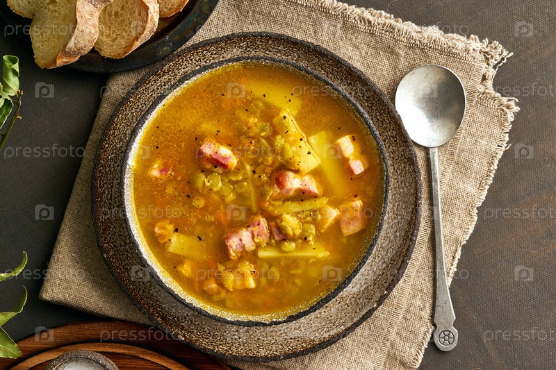 Зимний горячий суп с рубленым зеленым горошком, свининой, беконом, копченым