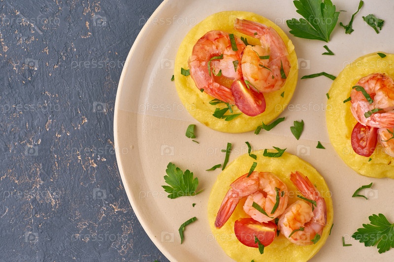 Полента с креветками - диетическое блюдо без глютена, вид сверху, пространство для копирования