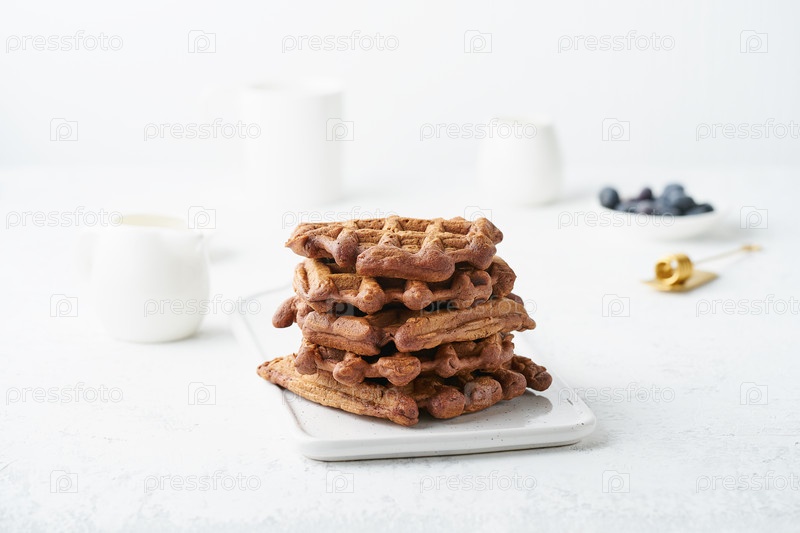 Шоколадно-банановые вафли на белом столе. Скандинавский минималистский стиль, вид сбоку