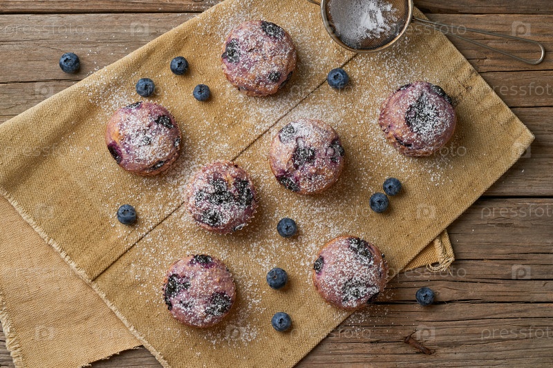 Черничный кекс, вид сверху. Кексы с ягодами на старой деревенской льняной салфетке, деревянный стол