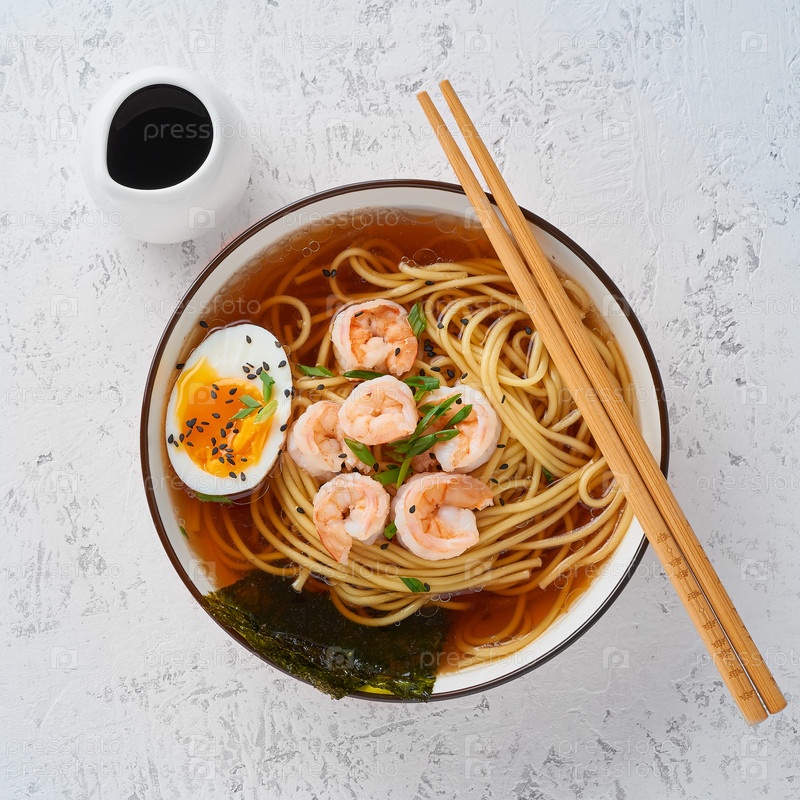 Азиатский суп с лапшой, рамэн с креветками, паста мисо, соевый соус. Белокаменный стол, вид сверху