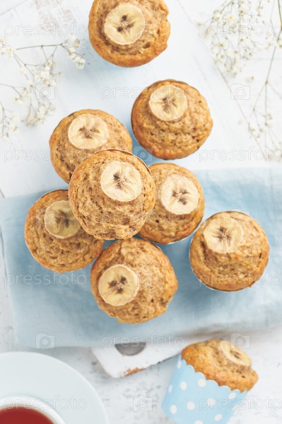 Банановый кекс, вид сверху, крупный план, вертикальный. Утренний завтрак на синей салфетке, белом бетонном столе