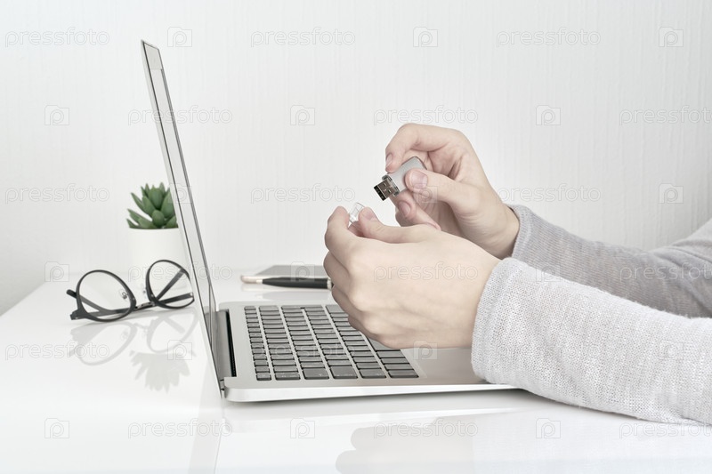 Человек открывает флешку USB рядом с ноутбуком, концепция офисной работы на фоне белой стены