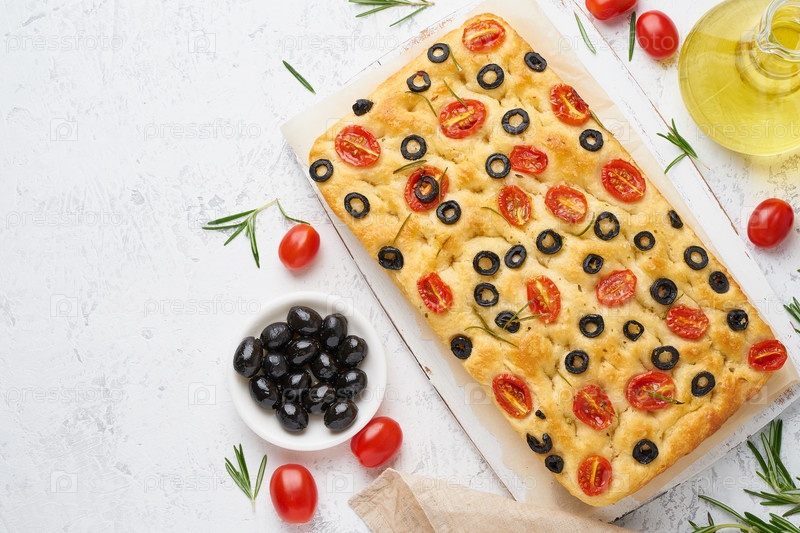 Фокачча с помидорами, оливками и розмарином, пространство для копирования, вид сверху. Цельнозерновая итальянская лепешка
