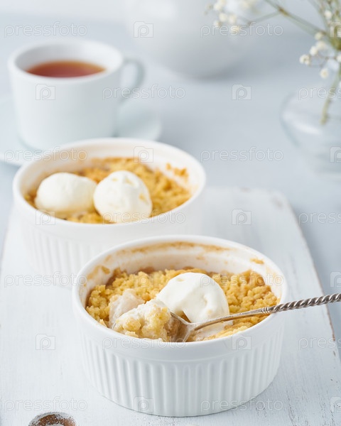 Яблочную крошку с мороженым, ложку со штрейзелем. Вид сбоку, вертикально. Утренний завтрак