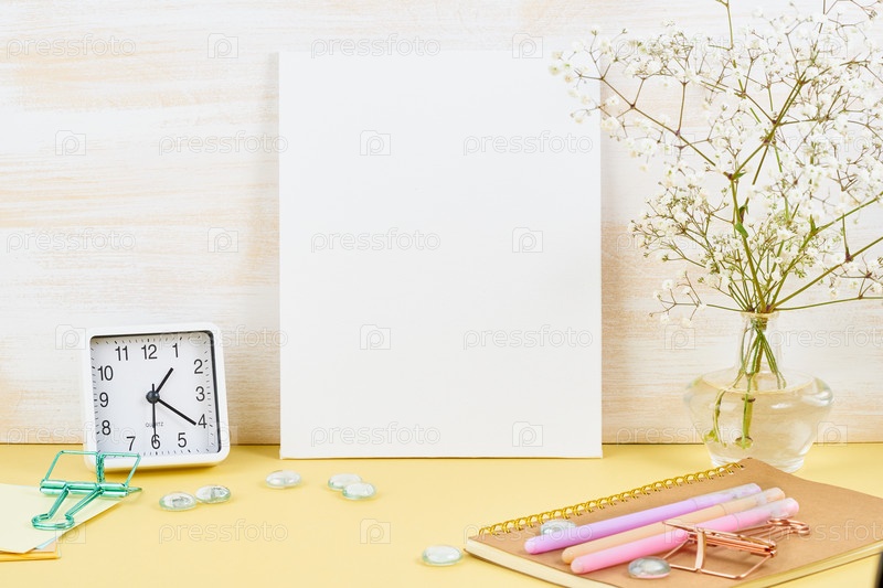 Макет с пустой белой рамкой на желтом столе у деревянной стены, сигнализация, цветок в вазе