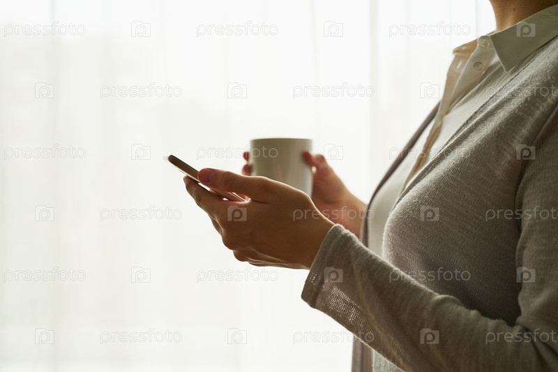Неузнаваемая женщина, держащая чашку чая/кофе, копия пространства, вид сбоку крупным планом