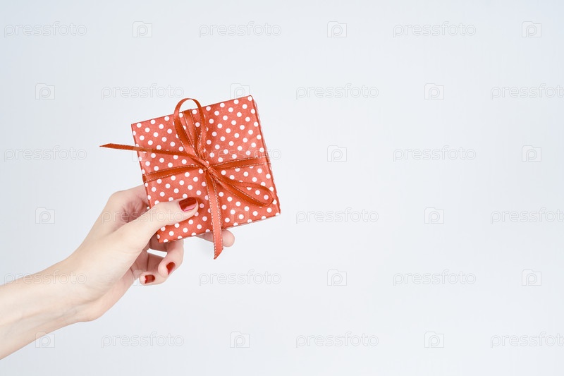 Женская рука держит красный подарок с лентой, ухоженная рука с лаком для ногтей на белом фоне с копировальным пространством