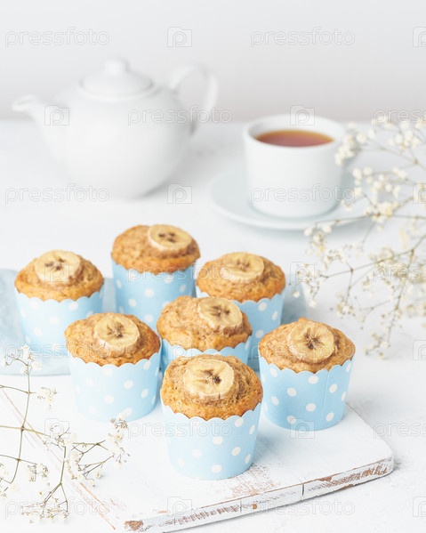 Банановый кекс, кексы в синей бумаге для тортов, вид сбоку, вертикальный, белый бетонный стол