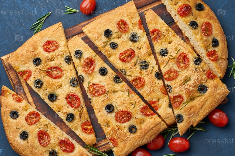 Фокачча, пицца, итальянская лепешка с помидорами, оливками и розмарином на темно-синем столе, вид сверху
