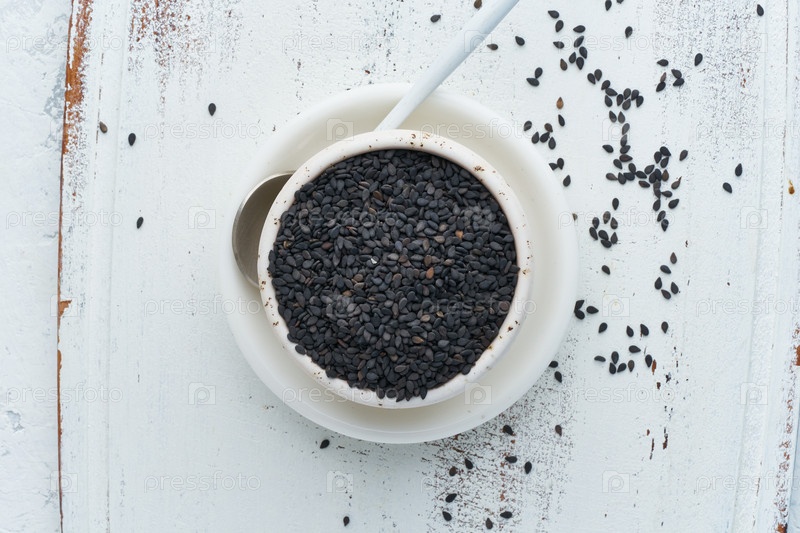 Черный кунжут на белой миске с ложкой. Белый деревянный фон. Вид сверху, крупным планом. Копирование пространства
