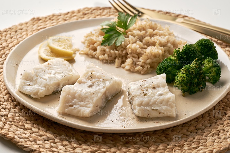 Треска на пару с коричневым рисом и овощами, диета Dash Fodmap, вид со стороны