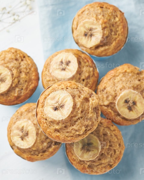 Банановый кекс, вид сверху, крупный план, вертикальный. Утренний завтрак на синей салфетке