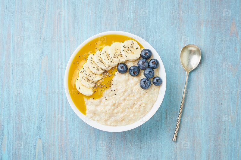 Овсянка с бананами, черникой, семенами чиа, вареньем на синем деревянном фоне. Вид сверху. Здоровый завтрак