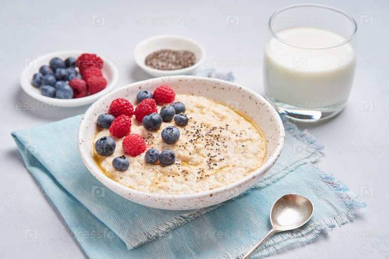 Овсянка с ягодами, чиа, кленовым сиропом и стаканом молока