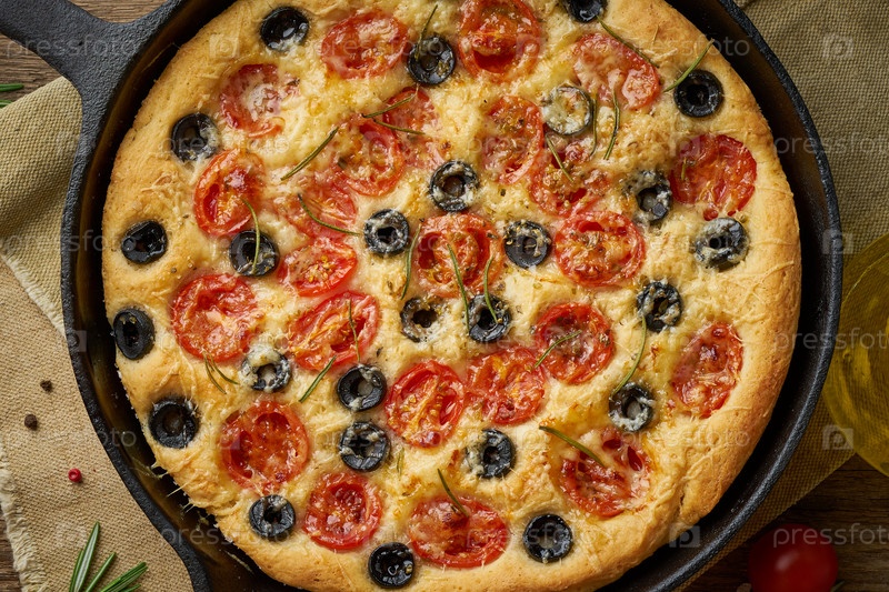 Фокачча, пицца на сковороде, итальянская лепешка с помидорами, оливками и розмарином. Деревянный стол