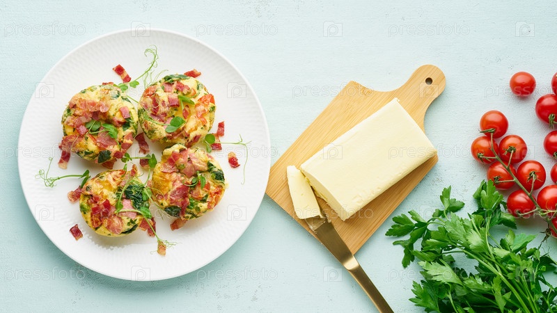 Яичный кекс, запеченный с беконом и помидорами, кетогенная кето-диета, пастельный современный баннер с видом сверху, длинный