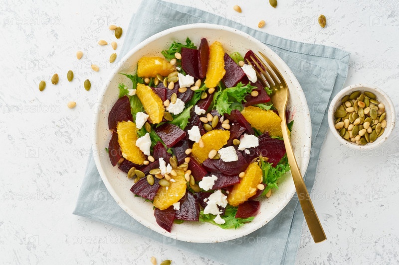 Веганский салат со свекольным творогом, авокадо, апельсином, фетой, рикоттой и тыквенными семечками, кето-диета,