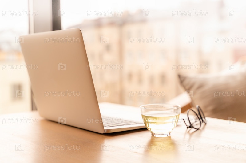 Внештатный стол с открытым ноутбуком, чашкой зеленого чая и стаканами на столе