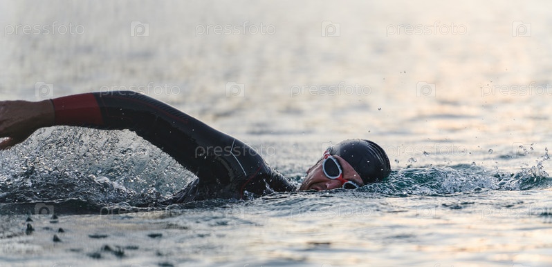 Профессиональный триатлонист с непоколебимой преданностью тренируется перед предстоящими соревнованиями на озере, излучая чувство атлетизма и глубокое стремление к совершенству
