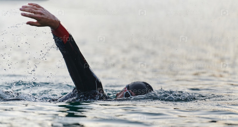 Профессиональный триатлонист с непоколебимой преданностью тренируется перед предстоящими соревнованиями на озере, излучая чувство атлетизма и глубокое стремление к совершенству