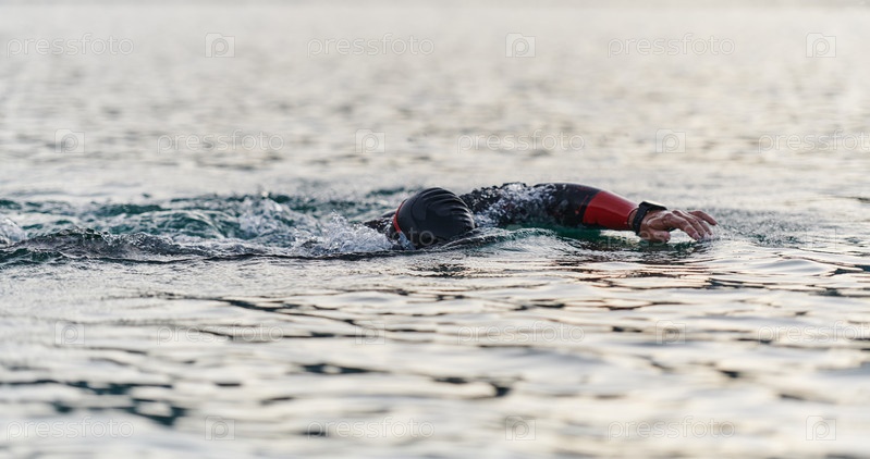 Профессиональный триатлонист с непоколебимой преданностью тренируется перед предстоящими соревнованиями на озере, излучая чувство атлетизма и глубокое стремление к совершенству