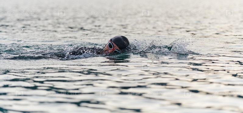 Профессиональный триатлонист с непоколебимой преданностью тренируется перед предстоящими соревнованиями на озере, излучая чувство атлетизма и глубокое стремление к совершенству