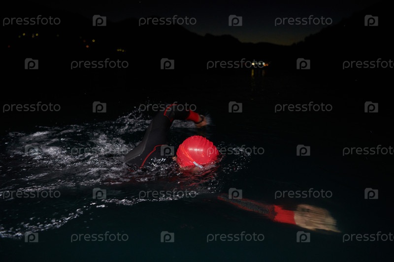 Решительный профессиональный триатлонист проходит тщательную ночную тренировку в холодной воде, демонстрируя преданность делу и стойкость в подготовке к предстоящим соревнованиям по триатлону по плаванию