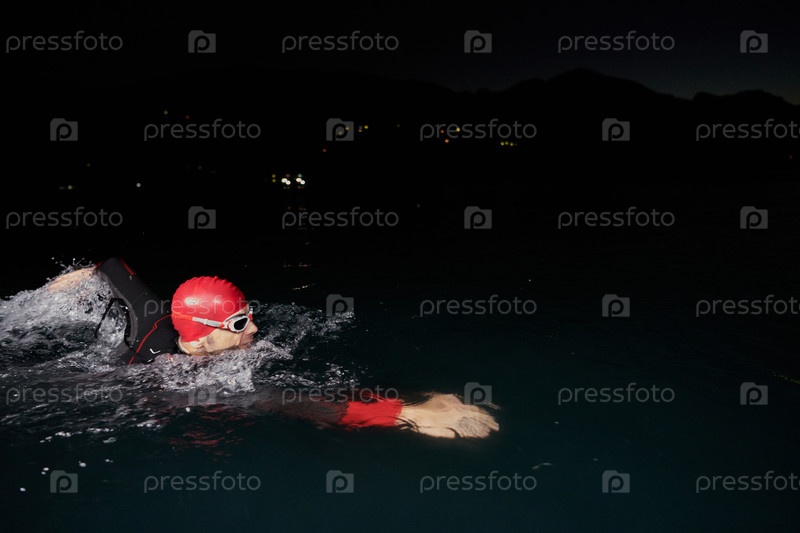 Решительный профессиональный триатлонист проходит тщательную ночную тренировку в холодной воде, демонстрируя преданность делу и стойкость в подготовке к предстоящим соревнованиям по триатлону по плаванию