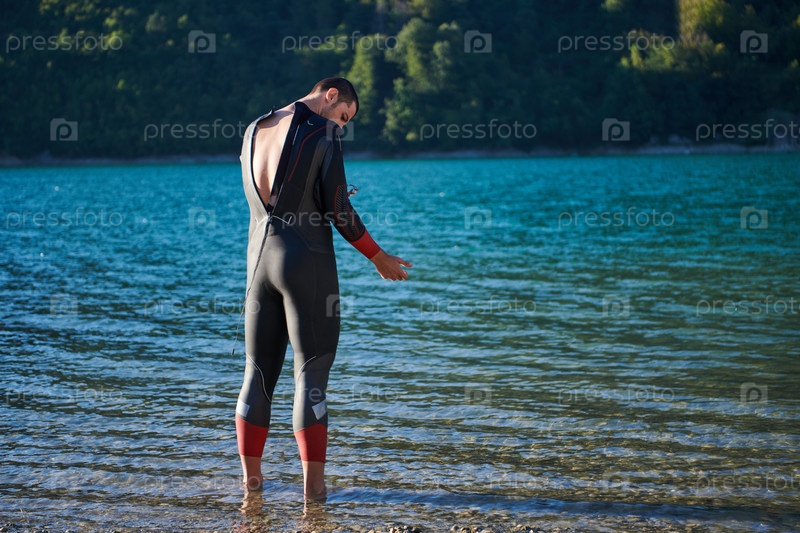 Настоящий спортсмен по триатлону готовится к тренировке по плаванию на озере