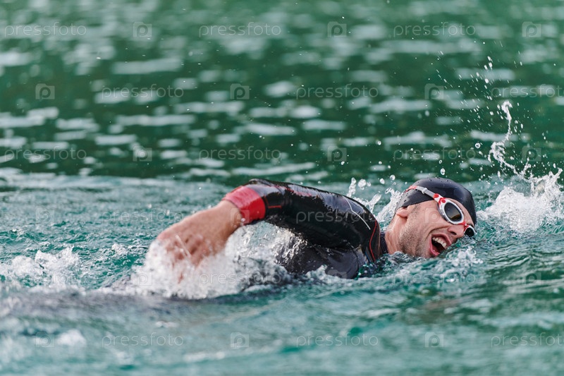 Профессиональный триатлонист с непоколебимой преданностью тренируется перед предстоящими соревнованиями на озере, излучая чувство атлетизма и глубокое стремление к совершенству