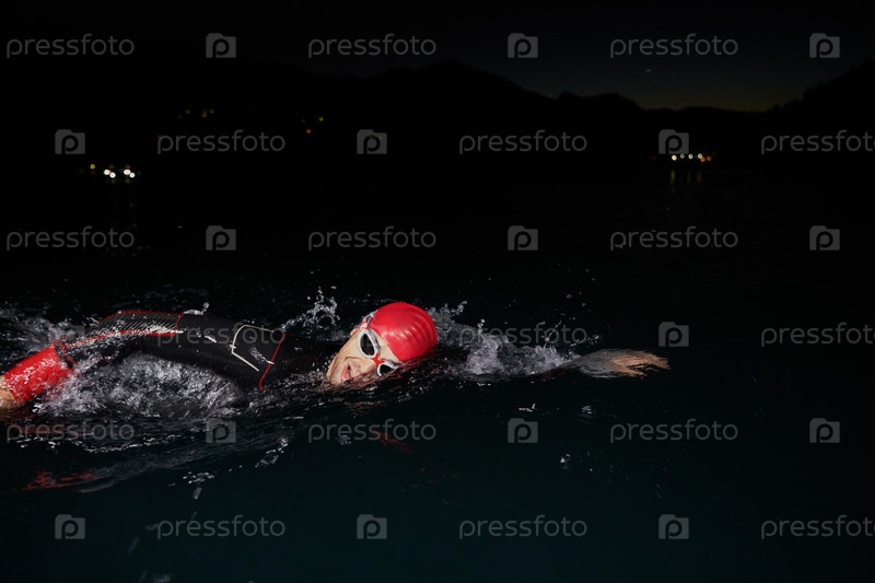 Решительный профессиональный триатлонист проходит тщательную ночную тренировку в холодной воде, демонстрируя преданность делу и стойкость в подготовке к предстоящим соревнованиям по триатлону по плаванию