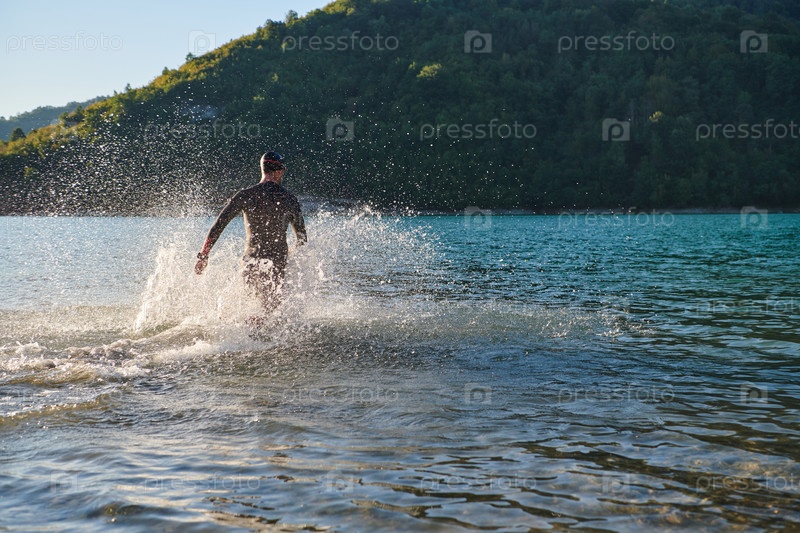Спортсмен по триатлону начинает тренировку по плаванию на озере