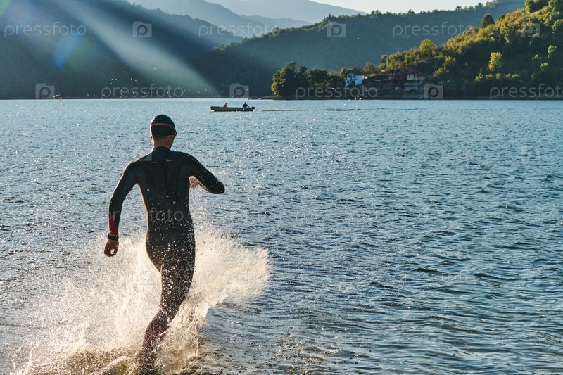 Спортсмен по триатлону начинает тренировку по плаванию на озере