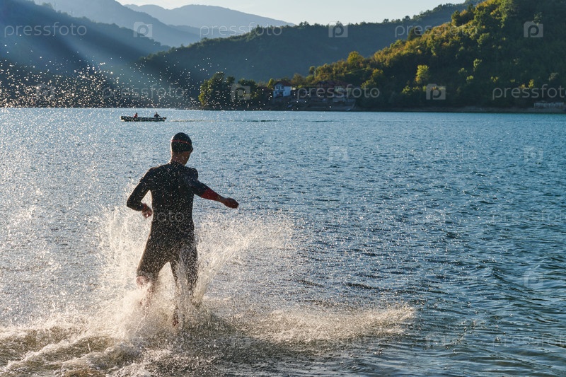 Спортсмен по триатлону начинает тренировку по плаванию на озере