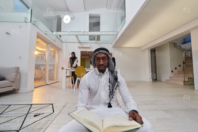 В священный месяц Рамадан афроамериканец-мусульманин, поглощенный чтением Священного Корана, окружен фоном, на котором три женщины в хиджабе готовят и подают еду для ифтара, изображая сцену духовной преданности, культурного единства и общественного праздн