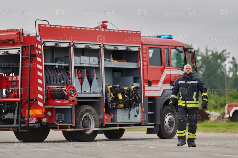 Символически храбрый пожарный шагает вперед с непоколебимым мужеством, олицетворяя самоотверженность и лидерство, в то время как позади него стоит современная пожарная машина, готовая к тушению пожара, отражающая суть героизма и готовности перед лицом чре