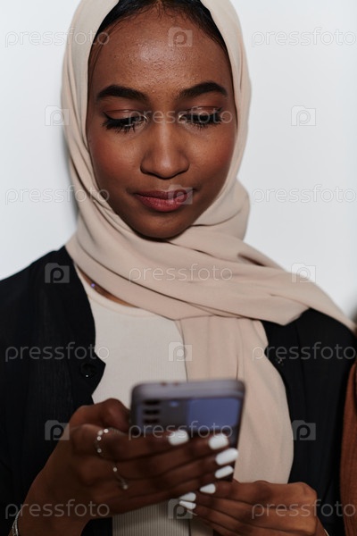 Элегантная арабская женщина, одетая в хиджаб, взаимодействует с современностью, используя смартфон: сопоставление традиционной одежды с современными технологиями, запечатленное в изолированной обстановке на первозданном белом фоне