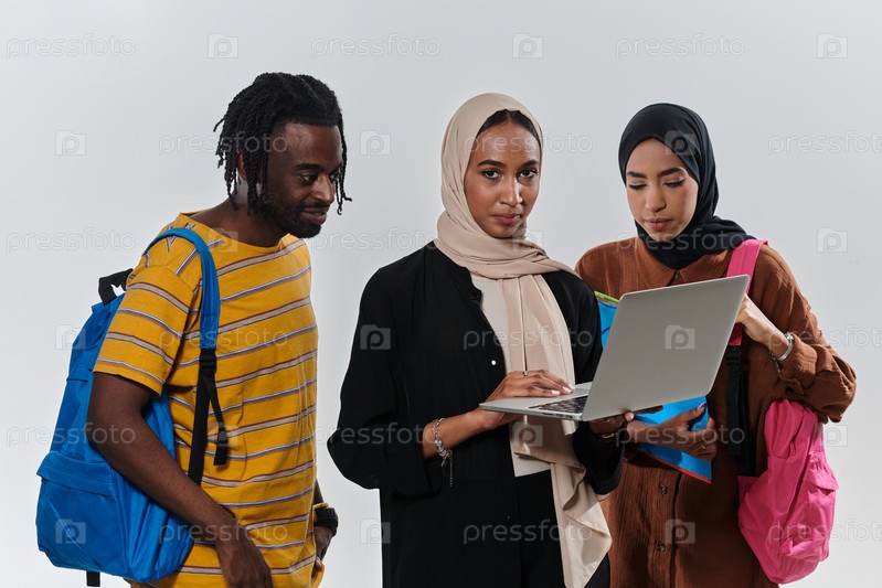 Группа студентов, в том числе афроамериканка и две женщины в хиджабе, стоят вместе на первозданно белом фоне, символизируя гармоничное сочетание культур и традиций в стремлении к знаниям и академическому совершенству